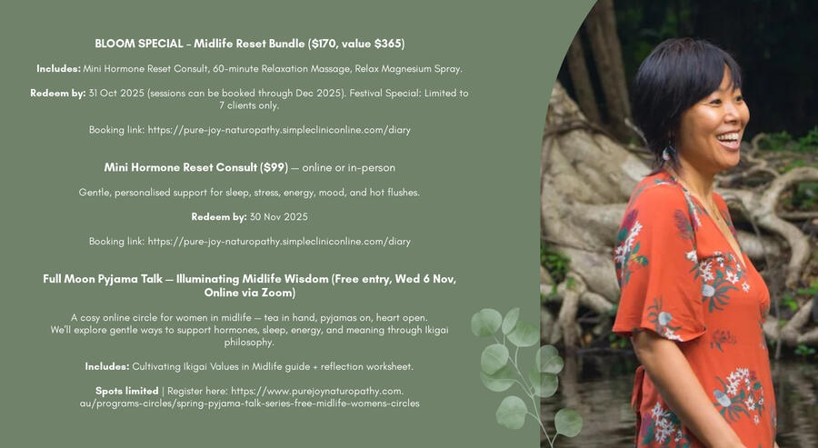 Pure Joy Naturopathy Bundle Specials + Free Full Moon Pyjama Talk — Illuminating Midlife Wisdom (Wed 6 Nov, Online via Zoom). Find out more here