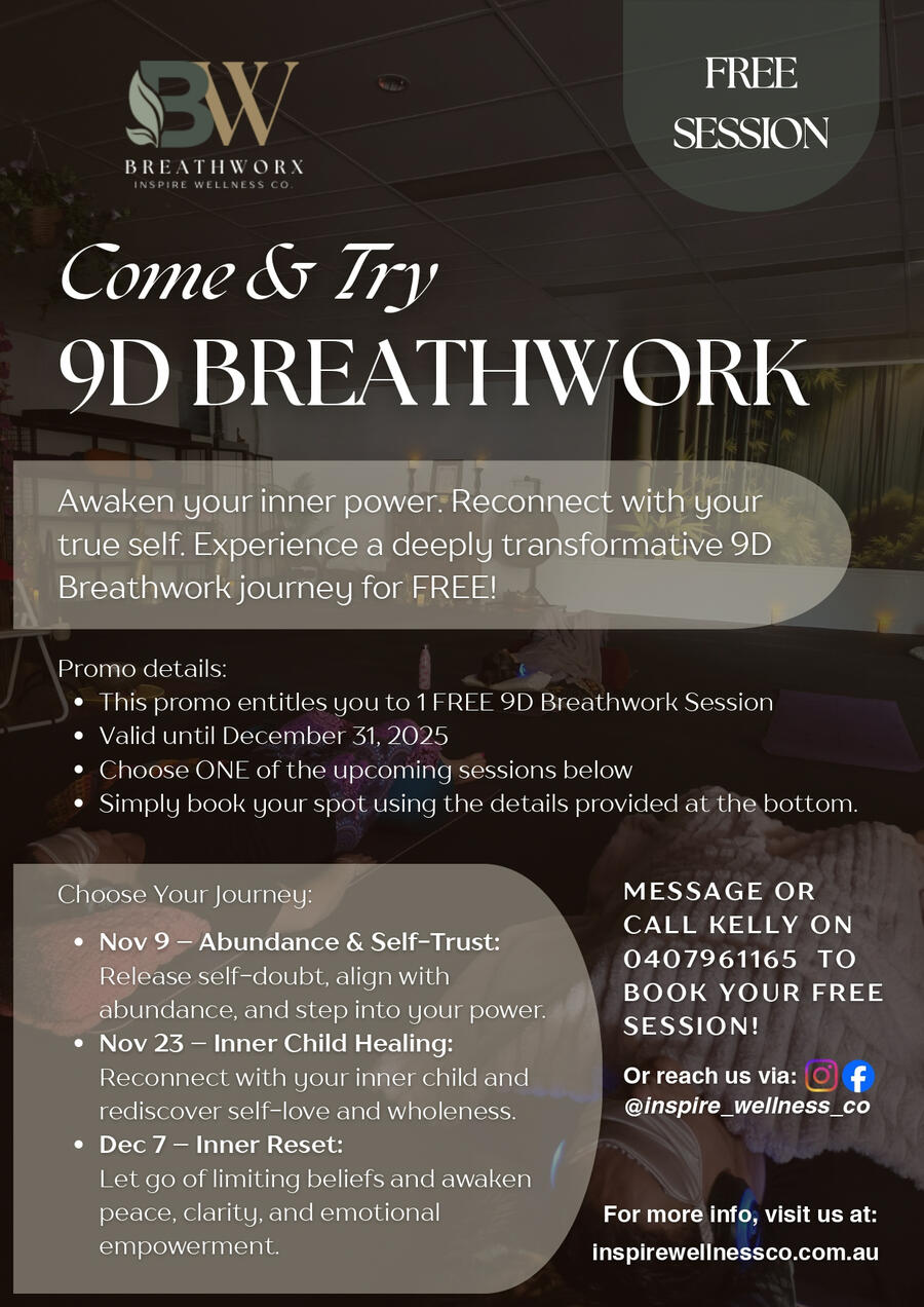 Inspire Wellness 1 x FREE Breathwork Session valid until 31 Dec, 2025.